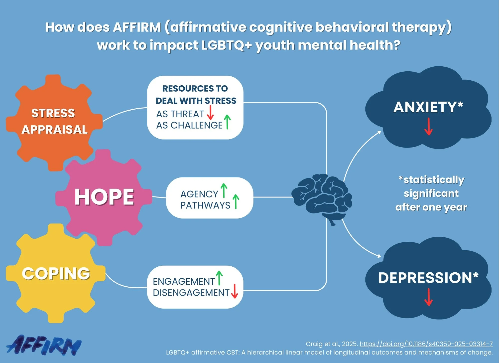 Results: Participants reported significant improvements in anxiety and depression from baseline to 1-year follow-up as well as increased engagement coping, social support, hope, and improved stress appraisal. SGDAYA, who appraised stress as a threat and had less ability to envision a hopeful future (hope pathway) at baseline, reported greater improvements in depression and anxiety; additionally, those who used more disengagement coping strategies prior to AFFIRM reported more reduction in depression. Participants with the most significant long-term improvement in depression reported (a) greater increases in their resources to deal with stress, (b) more uptake of engagement coping, and (c) improved hope pathway.
