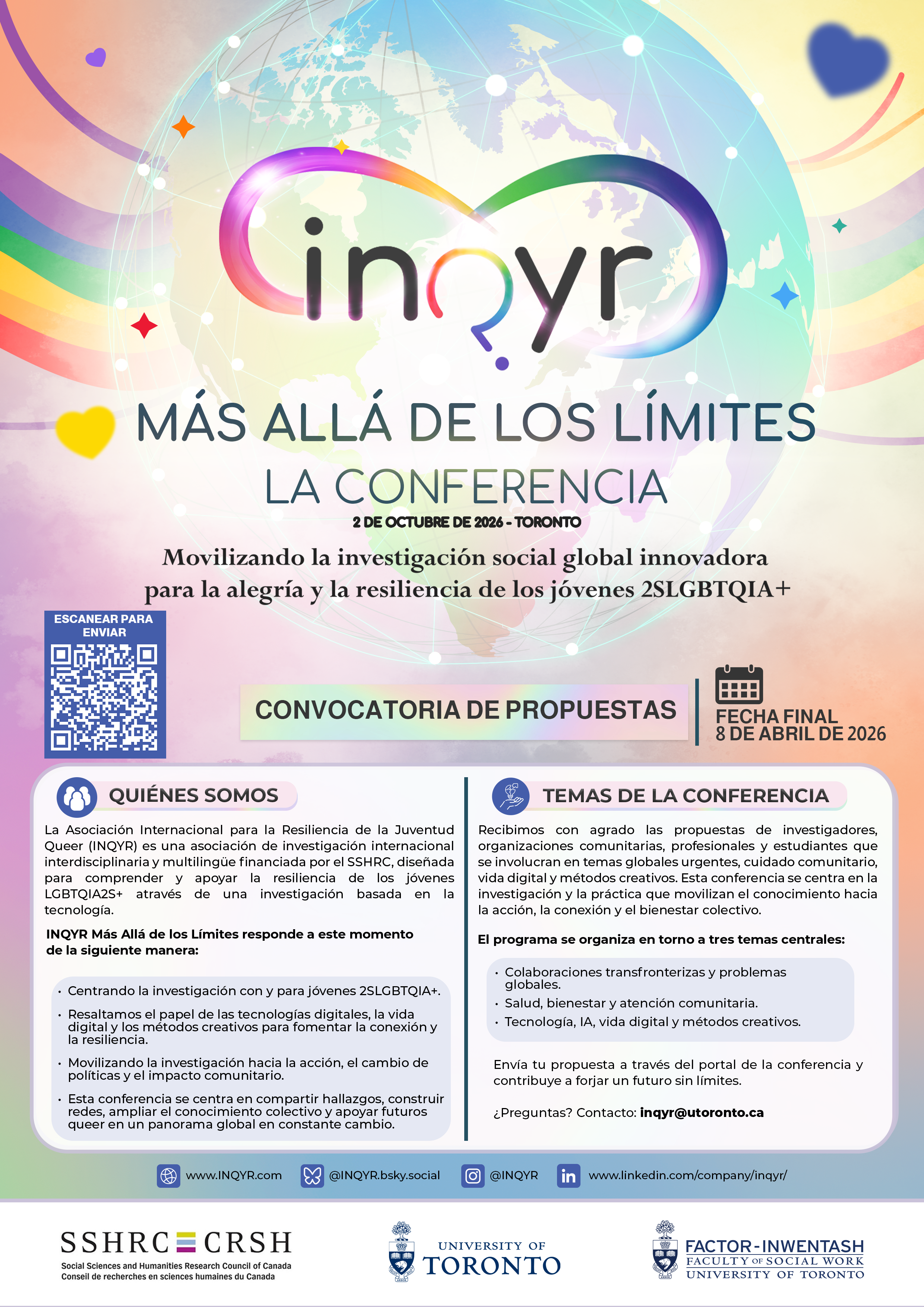 El barrio Church-Wellesley de Toronto es uno de los gaybourhoods más antiguos establecidos en CanadáLas atracciones de Toronto incluyen la icónica Torre CN, museos de clase mundial, senderos costeros y barrios vibrantes interminables esperando ser explorados.La ciudad, cuyo lema oficial es «Diversidad, nuestra fortaleza», ha sido reconocida tanto por las Naciones Unidas como por la BBC como la ciudad más diversa del mundoLa Universidad de Toronto, fundada en 1827, presume de una arquitectura neogótica impresionante y una beca de clase mundial —a solo pasos de nuestro lugar de la conferencia.INQYR Más Allá de los Límites es un espacio para avanzar en el conocimiento y la acción con y para jóvenes 2SLGBTQIA+. Se fundamenta en la convicción de que el conocimiento más sólido se construye colectivamente —a través de la investigación, la práctica, la comunidad y las experiencias vividas—, y que este conocimiento puede y debe impulsar cambios reales