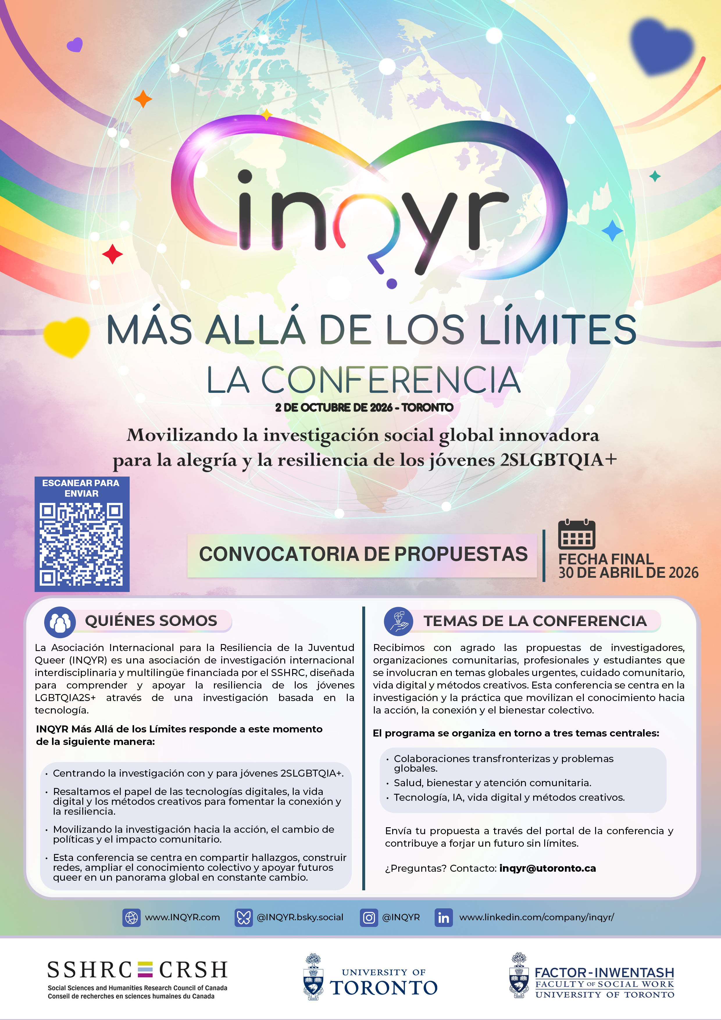 INQYR Más Allá de los Límites está dirigida a todas las personas comprometidas con avanzar en la salud, el bienestar y los derechos de jóvenes 2SLGBTQIA+, y a quienes creen que la investigación, la práctica y el conocimiento comunitario pueden y deben impulsar un cambio real..